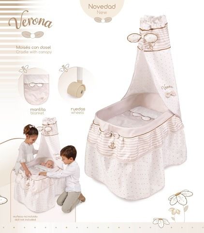 DeCuevas 51078 Pojízdná postýlka pro panenky s nebesy a peřinkou Verona 2024