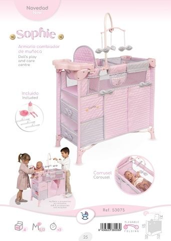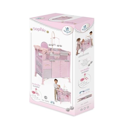 DeCuevas 53075 Skládací postýlka pro panenky s 5 funkčními doplňky Sophie 2025 patří do stejnojmenné kolekce, která je novinkou roku 2025 a nabízí nejen zmíněné kočárky, ale i jiné doplňky pro malé slečny a jejich panenky. Něžná dívčí kolekce Sophie je nepřehlédnutelná pro každé děvčátko. Světle růžová barva dominuje celé kolekci. Doplněná je o světle šedivé a bílé kraječky a mašličky, které zdobí všechny výrobky této rozmanité kolekce a ještě více podtrhují nádech romantiky.