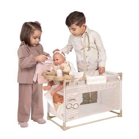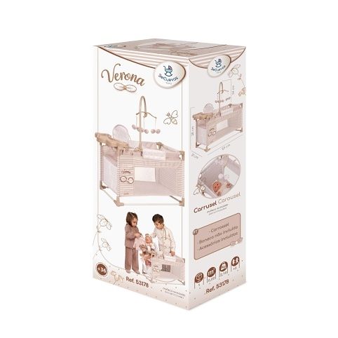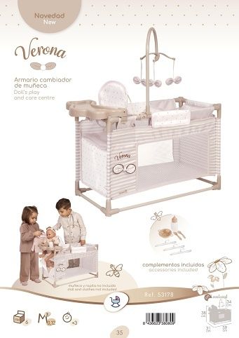 DeCuevas 53178 Moje první postýlka pro panenky s hracím centrem Verona 2025 ze stejnojmenné, velmi úspěšné kolekce z roku 2024 je u holčiček oblíbená díky svému rozmanitému příslušenství a úložnému prostoru, který ocení i pořádkumilovné maminky. Kolekce nabízí nejen zmíněné kočárky, ale i jiné doplňky pro malé slečny a jejich panenky. Decentně laděná kolekce Verona se celá nese v jemných pastelových přírodních barvách i vzorech. Kombinace světle béžové a bílé s roztomilými puntíky nebo proužky doplňuje světle hnědé úzké lemování, které zdůrazňuje dokonalost tvarů a krásně ladí s hnědými madly kočárků. Přírodní styl kolekce podtrhují aplikace mašliček zobrazující okvětní lístky a drobné výšivky včeliček. Nádherný španělský design, precizní zpracování. Velmi snadná manipulace během samotné hry. Materiál: kov, plast, textil. Baleno v krabici v barvách kolekce. Doporučený věk od 3 let.