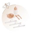 DeCuevas 53178 Moje první postýlka pro panenky s hracím centrem Verona 2025 patří do stejnojmenné, velmi úspěšné kolekce z roku 2024, která nabízí nejen zmíněné kočárky, ale i jiné doplňky pro malé slečny a jejich panenky. Tato decentní kolekce se celá nese v jemných pastelových přírodních barvách i vzorech. Kombinace světle béžové a bílé s roztomilými puntíky nebo proužky doplňuje světle hnědé úzké lemování, které zdůrazňuje dokonalost tvarů a krásně ladí s hnědými madly kočárků. Přírodní styl kolekce podtrhují aplikace mašliček zobrazující okvětní lístky a drobné výšivky včeliček.