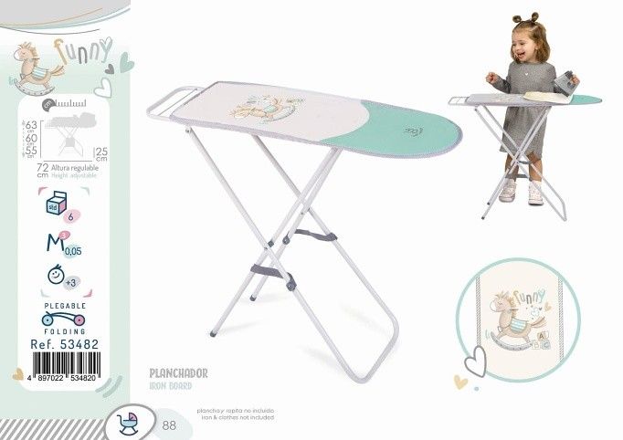 DeCuevas 53482 Skládací žehlicí prkno pro panenky FUNNY 2023 patří do stejnojmenné veselé kolekce FUNNY, která je novinkou roku 2023 a nabízí kromě různých druhů kočárků pro panenky i další doplňky pro budoucí maminky, hospodyňky a tatínky. Této velmi veselé kolekci vévodí roztomilý houpací koník s pruhovaným sedlem a barevnými hracími kostkami. Některé modely nalezneme ve sladěných barvách pastelově růžové s šedavou a smetanovou a jiné v mentolově zelené s šedavou a smetanovou barvou. Obě kombinace však působí velmi svěže a hravě.