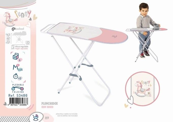 DeCuevas 53486 Skládací žehlicí prkno pro panenky FUNNY 2023 patří do stejnojmenné veselé kolekce FUNNY, která je novinkou roku 2023 a nabízí kromě různých druhů kočárků pro panenky i další doplňky pro budoucí maminky, hospodyňky a tatínky. Této velmi veselé kolekci vévodí roztomilý houpací koník s pruhovaným sedlem a barevnými hracími kostkami. Některé modely nalezneme ve sladěných barvách pastelově růžové s šedavou a smetanovou a jiné v mentolově zelené s šedavou a smetanovou barvou. Obě kombinace však působí velmi svěže a hravě.