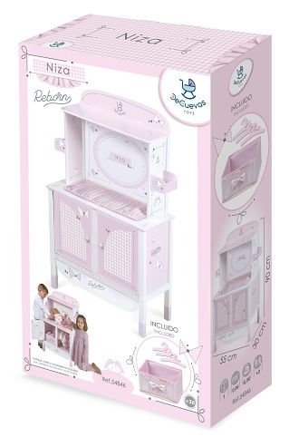 DeCuevas 54846 Dřevěná šatní skříň pro panenky s hracím centrem NIZA 2022, ze stejnojmenné něžně růžové kolekce NIZA která je novinkou roku 2022, je krásným a praktickým doplňkem dívčího pokojíčku. Spodní část skříně slouží jako šatní skříň. Tyč s ramínky a zásuvka poskytnou dostatek prostoru pro uložení oblečků. Horní část slouží jako přebalovací centrum. I zde je však díky dvěma malým poličkám možné uložit různé doplňky. Kolekce NIZA nabízí krom různých druhů kočárků i nábytek pro panenky a malé parádnice.