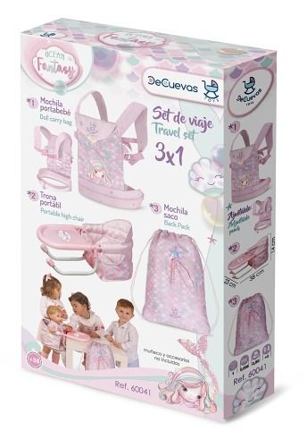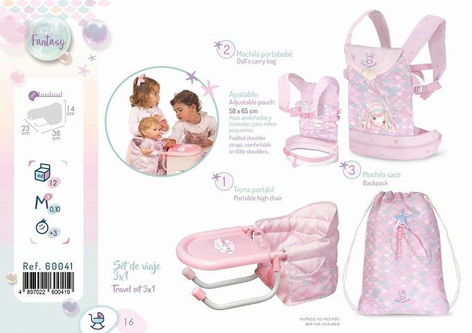 DeCuevas 60041 Cestovní set pro panenky 3 v 1 Ocean Fantasy 2021, z překrásné světle růžové kolekce s malou mořskou vílou, je nezbytnou součástí výbavy každé malé slečny, která bere ráda svou panenku s sebou na výlety. Ocení ji ale jistě i rodiče, díky jejímu praktickému využití. Přenosná židlička nahradí doma velkou jídelní židli a nosítko na panenku se dá vzít s sebou do auta přeci jen snadněji než kočárek.