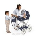 DeCuevas 80044 Skládací kočárek pro panenky s taškou Vintage 2025 - 81 cm patří do stejnojmenné kolekce, která nabízí nejen zmíněné kočárky, ale i jiné doplňky pro malé slečny a jejich panenky. Tato decentní stylová kolekce v kombinaci jen dvou barev je nerušená jiným barevným efektem. Jedná se o tmavě modrou a ledově bílou s jemným modrým potiskem. Jednoduché ozdoby ve tvaru bílých mašlí a úzké zdobné lemy s malými zoubky působí čistě. Do celého stylu vintage perfektně zapadají i madla kočárků z materiálu imitujícího dřevo či kůži, což v dnešní době vídáme často i na reálných dětských kočárcích.