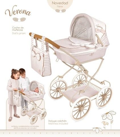 DeCuevas 80078 Skládací kočárek pro panenky s taškou Verona 2024 - 81 cm patří do stejnojmenné kolekce, která je novinkou roku 2024 a nabízí nejen zmíněné kočárky, ale i jiné doplňky pro malé slečny a jejich panenky. Tato decentní kolekce je celá nesena v jemných pastelových přírodních barvách i vzorech. Kombinace světle béžové a bílé s roztomilými puntíky nebo proužky doplňuje světle hnědé úzké lemování, které zdůrazňuje dokonalost tvarů a krásně ladí s hnědými madly kočárků. Přírodní styl kolekce podtrhují aplikace mašliček zobrazující okvětní lístky a drobné výšivky včeliček.