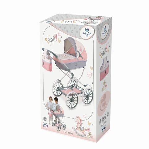 DeCuevas 80086 Skládací kočárek pro panenky s taškou FUNNY 2023 - 81 cm patří do stejnojmenné veselé kolekce FUNNY, která je novinkou roku 2023 a nabízí kromě různých druhů kočárků pro panenky i další doplňky pro budoucí maminky, hospodyňky a tatínky. Této velmi veselé kolekci vévodí roztomilý houpací koník s pruhovaným sedlem a barevnými hracími kostkami. Některé modely nalezneme ve sladěných barvách pastelově růžové s šedavou a smetanovou a jiné v mentolově zelené s šedavou a smetanovou barvou. Obě kombinace však působí velmi svěže a hravě.