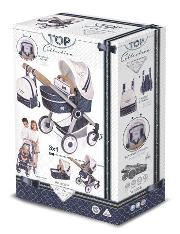 DeCuevas 80537 Skládací kočárek pro panenky 3 v 1 s batůžkem TOP Collection 2020 - 70 cm, z nové luxusní kolekce, zdobené stříbrnými prvky, je díky vyšší rukojeti a kombinované funkci hlubokého a sportovního kočárku spíš vhodný pro slečny předškolního věku, které toto vše už více při hraní využijí. Výhodou je i odnímatelná přenosná korbička, ve které lze přenášet bezpečně panenku. Po složení nezabírá mnoho místa a je praktický i pro převoz autem. Nádherný španělský design, precizní zpracování. Skládací model, velmi snadná manipulace během samotné hry. Materiál: kov, plast, textil. Baleno v krabici v barvách kolekce. Doporučený věk od 3 let.
