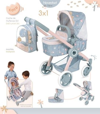 DeCuevas 80580 Skládací kočárek pro panenky 3 v 1 s batůžkem COCO 2024 - 70 cm, ze stejnojmenné kolekce, která je novinkou roku 2024, je díky vyšší rukojeti a kombinované funkci hlubokého a sportovního kočárku spíš vhodný pro slečny předškolního věku, které toto vše už více při hraní využijí. Výhodou je i odnímatelná přenosná korbička, ve které lze bezpečně přenášet panenku. Po složení nezabírá mnoho místa a je praktický i pro převoz autem. Kolekce nabízí nejen kočárky, ale i jiné doplňky nejen pro malé slečny a jejich panenky, ale také chlapce. V hravé kolekci COCO je dominantní obrázek dinosauří maminky se svým roztomilým mláďátkem, které nese na zadečku ještě vaječnou skořápku. Potisk malého dinosauříka na jemně holubičí šedomodré látce je základem celé kolekce, již zdobí prvky v pískové nebo narůžovělé barvě, která se promítá i do většiny nosných konstrukcí. Nádherný španělský design, precizní zpracování. Skládací model, velmi snadná manipulace během samotné hry. Materiál: kov, plast, textil. Baleno v krabici v barvách kolekce. Doporučený věk od 3 let.
