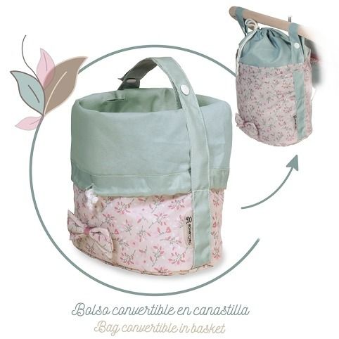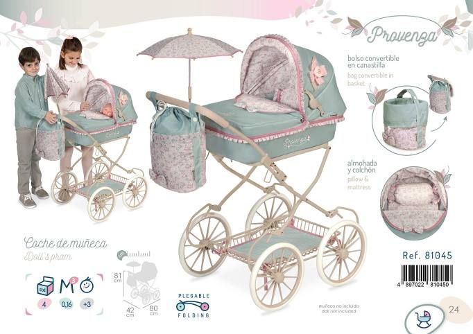 DeCuevas 81045 Skládací kočárek pro panenky s taškou a doplňky PROVENZA 2022 - 81 cm patří do stejnojmenné kolekce, která je novinkou roku 2022 a nabízí několik různých druhů kočárků. Pro tuto nevšední bohatě zdobenou kolekci provensálského romantického stylu je charakteristická světlounce narůžovělá barva s potiskem něžných drobných kvítků a jako vodní hladina světle zelenomodrá, zdobená výrazně růžovým lemováním, doplněným drobným volánkem. Kolečka a madla kočárků jsou v přírodní barvě, která tento francouzský styl doplňuje.