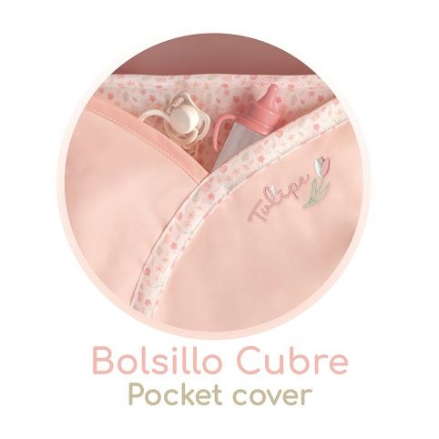 DeCuevas 81074 Skládací kočárek pro panenky s taškou a doplňky Tulipe 2025 - 81 cm patří do stejnojmenné kolekce, která je novinkou roku 2025 a nabízí výběr výrobků od jídelních sad přes postýlky a kočárky až po dřevěný nábytek pro panenky. Tulipe je, jak již sám název napovídá, kolekce plná tulipánů v překrásně sladěných teplých pastelových lososových barvách. Světlejší a tmavší odstíny barev jsou vkusně doplněné drobným květinovým vzorem ve stejných tónech na bílosmetanovém podkladu. Tento motiv ještě navíc u kočárků umocňují svým tematickým tvarem i překrásné, jako tulipán vypadající tašky. Květ tulipánu zdobí i dřevěné výrobky této kolekce.