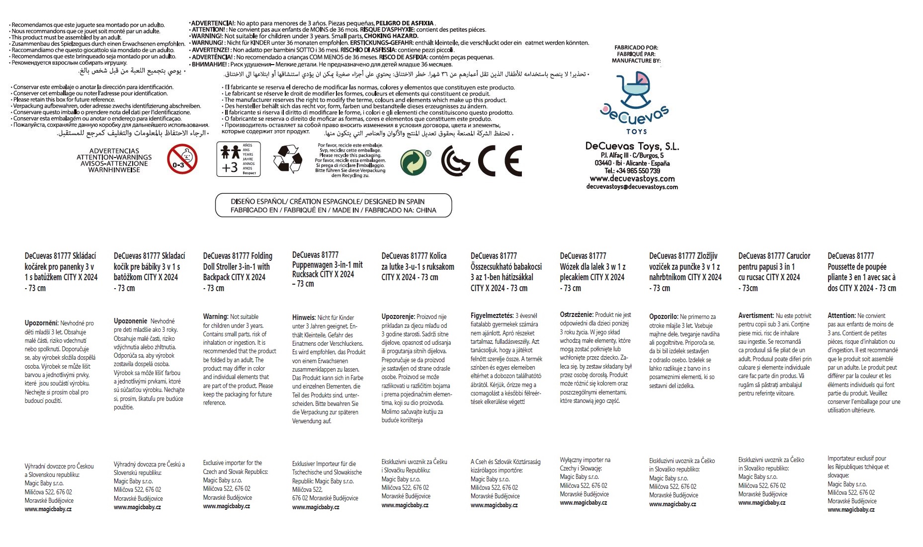 DeCuevas 81777 Skládací kočárek pro panenky 3 v 1 s batůžkem CITY X 2024 - 73 cm patří do stejnojmenné kolekce, která je novinkou roku 2024 a nabízí několik různých druhů kočárků. Supermoderní kolekce CITY X představuje kombinaci nevšedních materiálů. Standardní látky jsou doplněny o designově zpracovaný materiál PVC s potiskem, jež vytváří efekt skleněných ploch, které do dnešních moderních měst patří. Celou tuto stříbrošedou kolekci zdobí prvky v trendy měděné barvě, která podtrhuje lehkost a vzdušnost celé výjimečné kolekce.Doplňky a vybavení:• Odnímatelná hluboká korbička s možností umístění ve směru i proti směru jízdy a přeměnitelná na sportovně sedací variantu• Tříbodový pásový systém pro uchycení panenky• Polohovací boudička z polstrované látky kombinované s průsvitným plastem• Kryt na korbičku s průsvitnou kapsou se zipem a se suchými zipy pro uchycení• Moderní batůžek na kočárek nebo na záda s průsvitnou kapsou • Úložný prostor v dolní části kočárku• Otočná přední kolečka pro snadnější jízdu• Rozměry kočárku: 65 × 38 × 73 cm (výška k rukojeti)• Vnitřní rozměr korbičky: 49 x 23 cm (d x š) • Panenka není součástíDoplňující informace:• Nádherný španělský design• Precizní zpracování• Skládací model• Velmi snadná manipulace během samotné hry• Materiál: kov (chrom a hliník), plast, textil• Baleno v krabici v barvách kolekce• Rozměry balení: 61 x 14 x 41 cm (d x š x v) • Váha balení: 6,3 kg • U vybraných modelů je na obalech QR kód s video návodem na sestavení • Doporučený