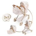 DeCuevas 81778 Skládací kočárek pro panenky 3 v 1 s taškou Verona 2025 - 73 cm, ze stejnojmenné kolekce, který je nově přidaný do kolekce v roce 2025, je díky vyšší rukojeti a kombinované funkci hlubokého a sportovního kočárku spíš vhodný pro slečny předškolního věku, které toto vše už více při hraní využijí. Obdiv si tento kočárek právem zaslouží za svůj design, který dokonale kopíruje dnešní moderní reálné dětské kočárky celosvětově známých značek jako je třeba Cybex Priam. Výhodou je i odnímatelná přenosná korbička, ve které lze bezpečně přenášet panenku. Po složení nezabírá mnoho místa a je praktický i pro převoz autem. Kolekce nabízí nejen zmíněné kočárky, ale i jiné doplňky pro malé slečny a jejich panenky. Decentně laděná kolekce Verona je celá nesena v jemných pastelových přírodních barvách i vzorech. Kombinace světle béžové a bílé s roztomilými puntíky nebo proužky doplňuje světle hnědé úzké lemování, které zdůrazňuje dokonalost tvarů a krásně ladí s hnědými madly kočárků. Přírodní styl kolekce podtrhují aplikace mašliček zobrazující okvětní lístky a drobné výšivky včeliček. Nádherný španělský design, precizní zpracování. Skládací model, velmi snadná manipulace během samotné hry. Materiál: kov, plast, textil. Baleno v krabici v barvách kolekce. Doporučený věk od 3 let.