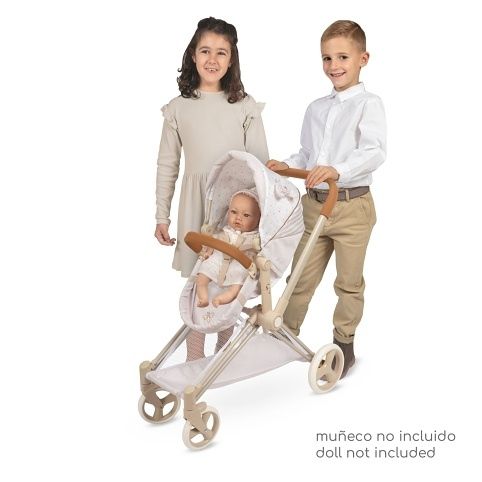 DeCuevas 81778 Skládací kočárek pro panenky 3 v 1 s taškou Verona 2025 - 73 cm patří do stejnojmenné kolekce, který je nově přidaný do kolekce v roce 2025 a nabízí nejen zmíněné kočárky, ale i jiné doplňky pro malé slečny a jejich panenky. Tato decentní kolekce je celá nesena v jemných pastelových přírodních barvách i vzorech. Kombinace světle béžové a bílé s roztomilými puntíky nebo proužky doplňuje světle hnědé úzké lemování, které zdůrazňuje dokonalost tvarů a krásně ladí s hnědými madly kočárků. Přírodní styl kolekce podtrhují aplikace mašliček zobrazující okvětní lístky a drobné výšivky včeliček.
