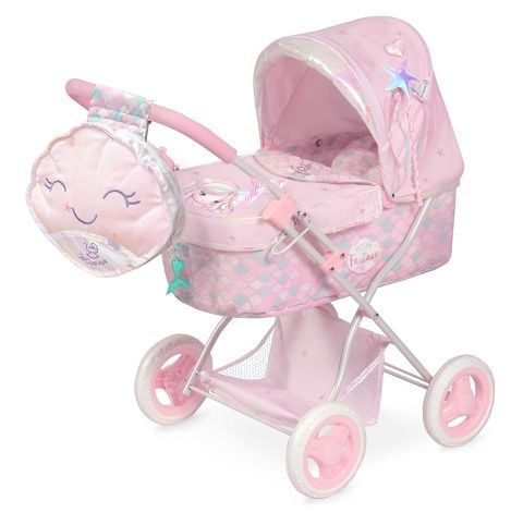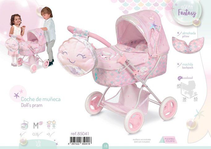 DeCuevas 85041 Skládací kočárek pro panenky s batůžkem a doplňky Ocean Fantasy 2021 - 60 cm je z překrásné světle růžové kolekce s malou mořskou vílou. Letošní kolekci zdobí třpytivé, částečně měnící se flitry na ocásku víly, které připomínají rybí šupinky. Mořské hvězdice, roztomilé polštářky ve tvaru ocasní ploutvičky a hladké lesklé lemování, které vytváří duhové efekty, doplňují tuto mořskou pohádkovou tématiku. V kolekci Ocean Fantasy 2021 najdeme největší výběr výrobků od cestovních a jídelních sad přes postýlky a kočárky, až k dřevěnému nábytku, nejenom pro panenky.