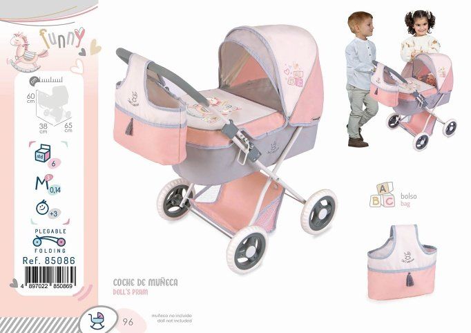 DeCuevas 85086 Skládací kočárek pro panenky s taškou FUNNY 2023 - 60 cm patří do stejnojmenné veselé kolekce FUNNY, která je novinkou roku 2023 a nabízí kromě různých druhů kočárků pro panenky i další doplňky pro budoucí maminky, hospodyňky a tatínky. Této velmi veselé kolekci vévodí roztomilý houpací koník s pruhovaným sedlem a barevnými hracími kostkami. Některé modely nalezneme ve sladěných barvách pastelově růžové s šedavou a smetanovou a jiné v mentolově zelené s šedavou a smetanovou barvou. Obě kombinace však působí velmi svěže a hravě.