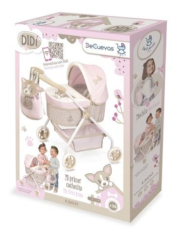 DeCuevas 86043 Můj první kočárek pro panenky s batůžkem DIDI 2021 – 56 cm, z doslova okouzlující, něžné, růžovo bílo hnědé kolekce s malým roztomilým štěňátkem DIDI, je díky nízké rukojeti, stabilní konstrukci a lehké váze vhodný především pro úplně malé slečny. K jeho kouzelnému vzhledu přispívá i kombinace použitých běžných hladkých materiálů v kontrastu se sametovou výšivkou malého pejska a jinými sametovými doplňky.