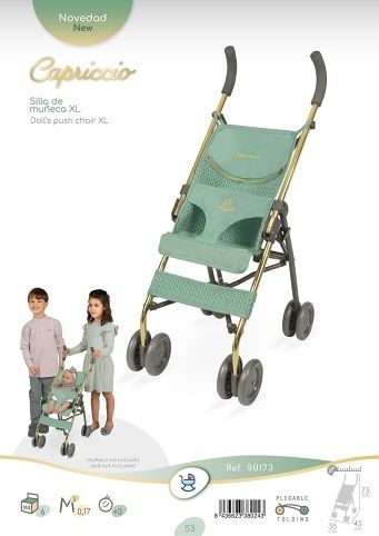 DeCuevas 90173 Skládací kočárek pro panenky golfové hole XL Capriccio 2025 - 75 cm ze stejnojmenné kolekce, která je novinkou roku 2025, je velmi praktický a skladný kočárek, což ocení především rodiče. V autě nezabere skoro žádné místo, a proto je ideálním kočárkem na výlety celé rodiny. Oblíbený je ale i v interiéru. Díky své velikosti je spíš vhodný pro slečny předškolního věku. Tato úžasná kolekce Capriccio není nová jen svou nezaměnitelnou moderní mentolově zelenou barvou, ale také svým zdobným zpracováním. Jedná se o imitaci úpletu rafinovaně kombinovaného s hladkou moderní látkou. Rám a podvozek kočárků tvoří tmavě šedá se zlatými prvky, které jsou vkusně uplatněny v podobě zlatých zipů a výšivky Capriccio na textilní části kočárků a doplňkové tašce. Kolekce Capriccio nabízí několik různých druhů kočárků. Nádherný španělský design, precizní zpracování. Skládací model, velmi snadná manipulace během samotné hry. Materiál: kov, plast, textil. Baleno v krabici v barvách kolekce. Doporučený věk od 3 let.