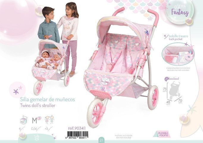 DeCuevas 90341 Skládací kočárek tříkolový pro dvojčata panenky Ocean Fantasy 2021 - 75 cm, z překrásné světle růžové kolekce s malou mořskou vílou, je díky vyšší rukojeti spíš vhodný pro slečny předškolního věku.