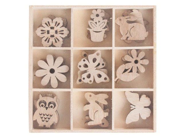 Velikonoční dřevěná dekorace v přírodní barvě v mixu motivů. Plánujete si udělat pohodové odpoledne a vyzdobit si dům nebo zahradu a přivítat tak jaro? Pak vám nesmí chybět tyto krásné dekorace v podobě různě barevných srdcí. Dekoraci lze použít k aranžování velikonočních věnců nebo větviček. Vyrobeno z překližky. OBSAH BALENÍ: - 27 ks dekorací Velikost: 25 mm Materiál: dřevo Barva: přírodní Motiv: květina, zajíc, sova Uvedená cena je za 1 balení.