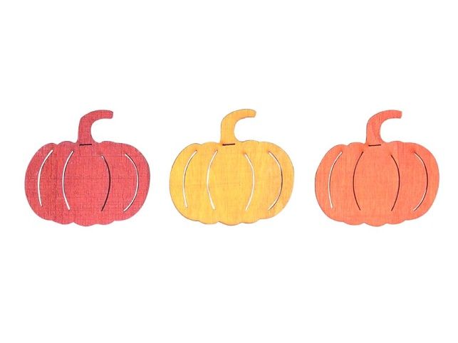 Podzimní, dřevěná dekorace dýně. Plánujete si udělat pohodové podzimní odpoledne a vyzdobit si dům nebo zahradu? Tyto dřevěné dekorace jsou tím vhodným kreativním doplňkem, které ozdobí každý kout Vaší místnosti! Vyrobeno z překližky. OBSAH BALENÍ: - 12 ks vyřezávaných barevných dýní (červená, žlutá, oranžová) Velikost: 40 mm Baleno v sáčku se závěsem. Uvedená cena je za 1 balení.