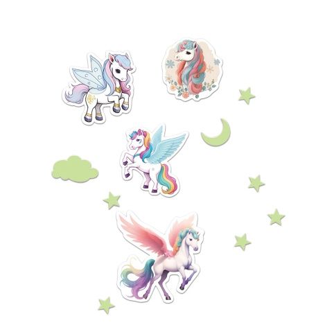 Barevná dekorace jednorožci na stěnu, nebo na nábytek. Po zhasnutí svítí ve tmě. Stačí nalepit a usínání bude hračka!