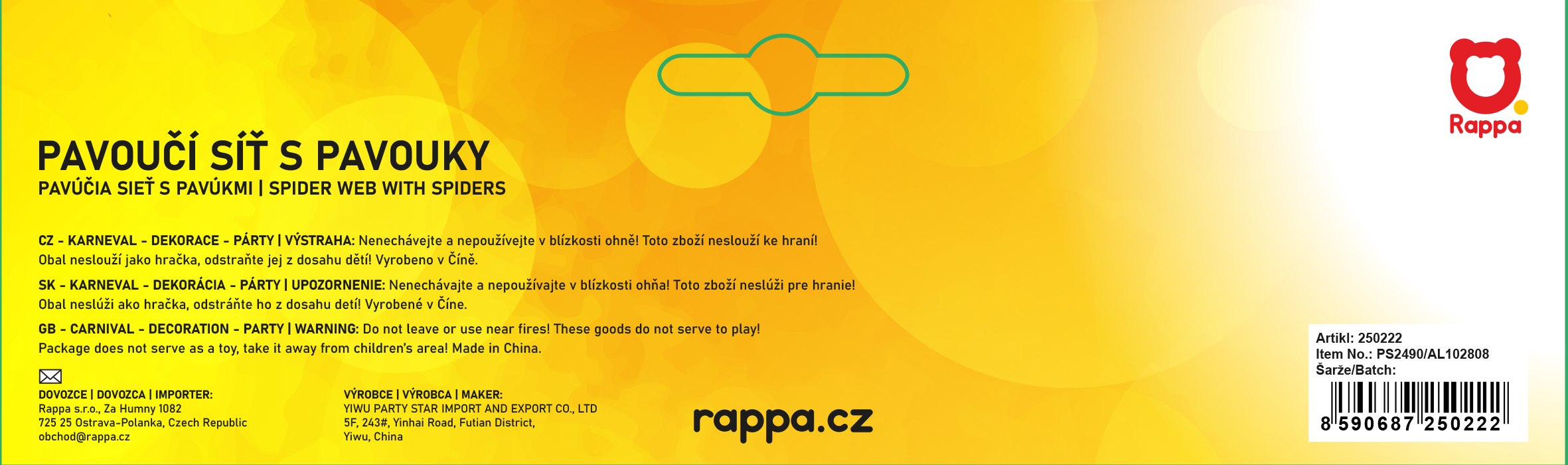 Senzační dekorace na Halloween párty! V balení najdeš 4 plastové pavoučky a pavučinu. Můžeš si tak tuto strašidelnou dekoraci dát kamkoli jen budeš chtít.