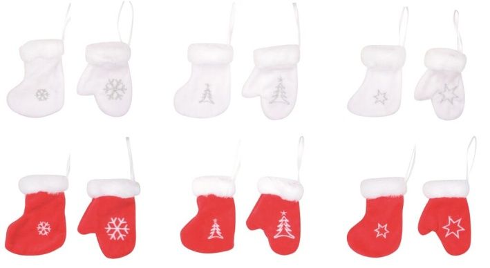 Dekorace Punčocha a rukavice 10 cm k zavěšení, červená a bílá / 18051