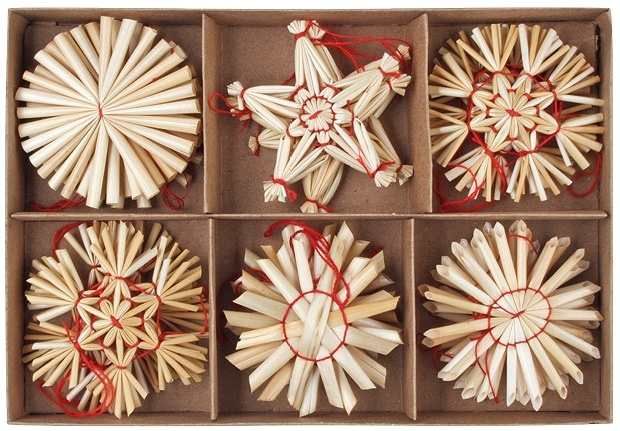 Slaměné ozdoby v krabičce Slaměné dekorace využijete k dekoračním a aranžérským účelům. Díky tenké šňůrce je snadno zavěsíte třeba na vánoční stromeček. 24 kusů v krabičce, mix motivů.