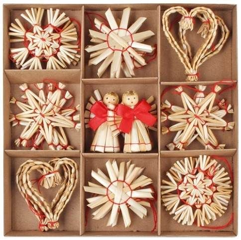 Slaměné ozdoby v krabičce Slaměné dekorace využijete k dekoračním a aranžérským účelům. Díky tenké šňůrce je snadno zavěsíte třeba na vánoční stromeček. 24 kusů v krabičce, mix motivů.