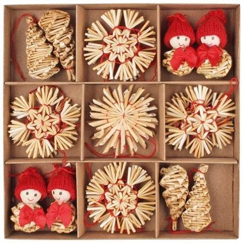 Slaměné ozdoby v krabičce Slaměné dekorace využijete k dekoračním a aranžérským účelům. Díky tenké šňůrce je snadno zavěsíte třeba na vánoční stromeček. 26 kusů v krabičce, mix motivů.