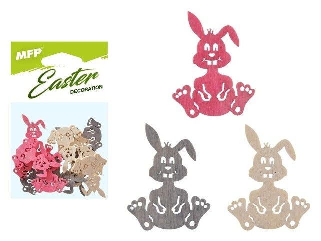 Velikonoční dekorace - zajíc dřevěný vyřezávaný - Ozdobte si byt touto krásnou dekorací. Dekoraci lze použít k aranžování věnců a různých doplňků do interiéru. BALENÍ OBSAHUJE: - 12ks zajíčků (červené, šedé, přírodní) Uvedená cena je za 1 balení.