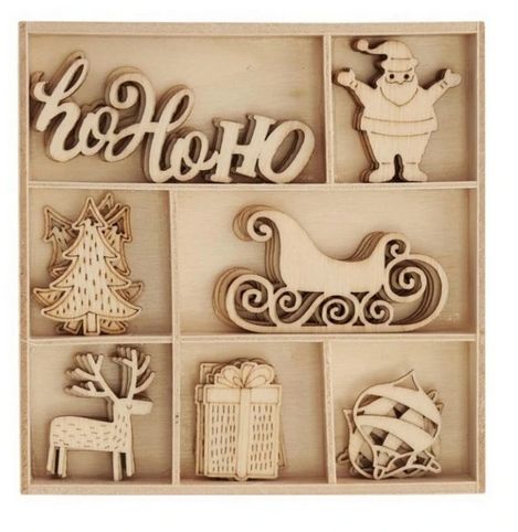 motivy: 7 různých motivů - nápis HOHOHO, Santa Claus, sáně, stromeček, sob, dáreček, vánoční ozdoba na stromeček