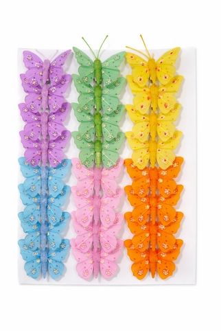 Motýlci mají detailně potištěná křídla s dekorativním vzorem a plastickým tělíčkem. Díky praktickému kovovému klipu je snadno připevníte na věnce, květinové vazby, záclony, větvičky, dárkové balení nebo sezónní aranžmá.