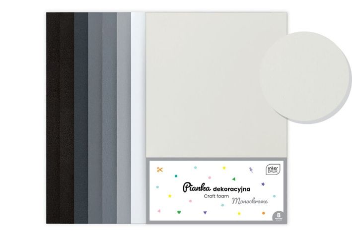 Dekorační pěnová guma A4 v tlumených odstínech šedých, černých a bílých. V balení 8 ks. Ideální pro výrobu přání, dekorací, 3D projektů, školních prací a ručně vyráběných dárků. Skvělá pomůcka pro domácí tvoření s dětmi.
