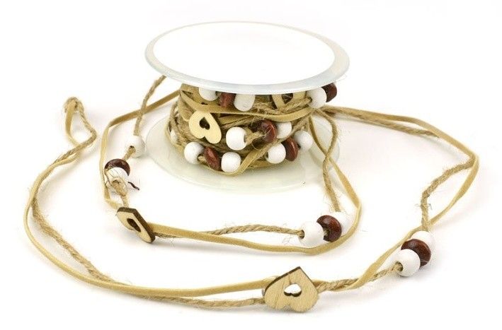 Dekorační provázek doplněný korálky a srdíčky je skvělým pomocníkem pro zkrášlení Vašich výrobků. Může se například hodit při výrobě venkovních dekorací nebo jako doladění sváteční tabule v přírodním stylu.