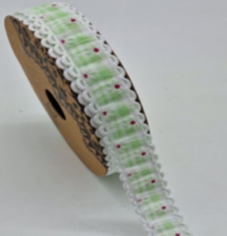 Dekorační stuha 2cm s kostkovaným vzorem a krajkou – zelenobílá s květy