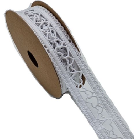 Romantická krajková stuha v bílé barvě s jemným vzorem propletených srdíček je ideální pro svatební dekorace, balení dárků, scrapbooking nebo různé tvořivé projekty. Kvalitní provedení s detailním lemem dodá každému výrobku elegantní a něžný vzhled.