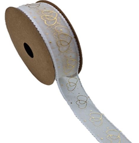 Elegantní dekorační stuha v bílé barvě s jemným zlatým potiskem propletených srdcí. Ideální pro svatební výzdobu, balení dárků, scrapbooking nebo kreativní tvoření. Stuha má pevné okraje pro snadnou manipulaci a udržení tvaru.