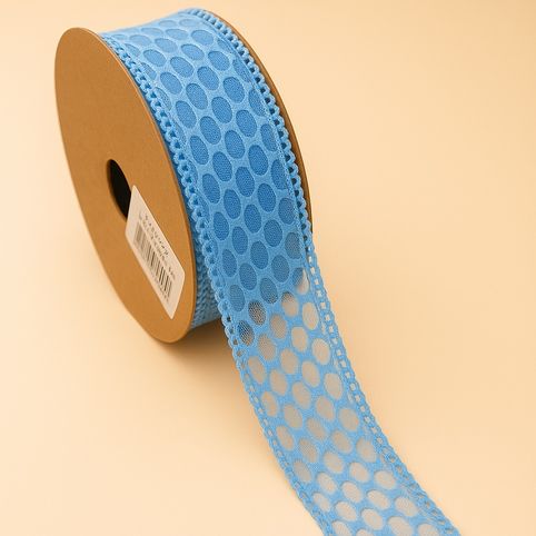 Elegantní modrá krajková stuha s jemným vzorem je ideální pro stylové a sofistikované dekorace. Díky svému průhlednému provedení s pravidelnými oválnými otvory se hodí pro svatební i slavnostní výzdobu, balení dárků, výrobu doplňků a zdobení textilu.