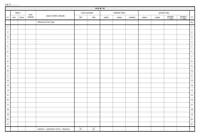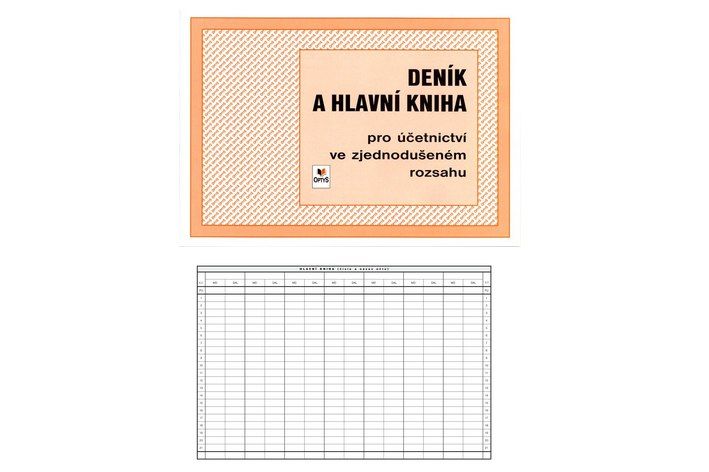 Deník a hlavní kniha. Nepropisovací tiskopis. Formát A4 naležato. Bílo-oranžová obálka. 41 listů.