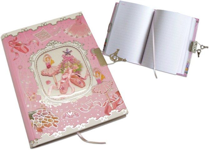 Deník s růžovým designem z dívčí sady. Uvnitř jsou čisté bílé a