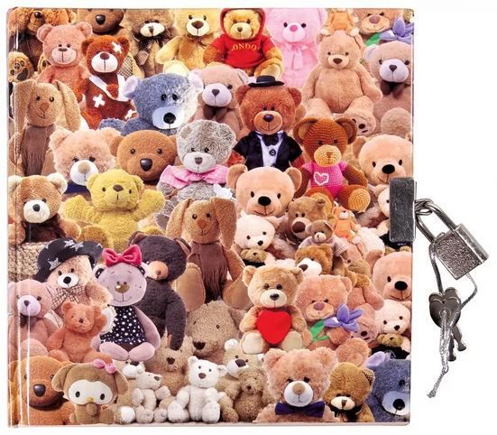Deníček v krásných pevných deskách s oblíbeným motivem plyšových medvídků, se slušivým zámečkem a uzamykáním na klíč .