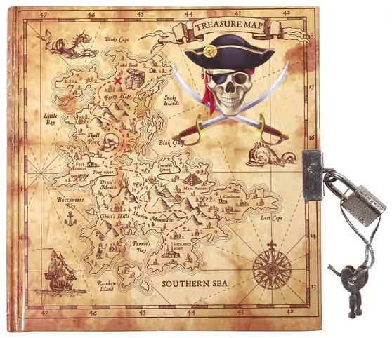 Deníček v krásných pevných deskách s oblíbeným pirátským motivem a se slušivým zámeček uzamykatelný na klíč .