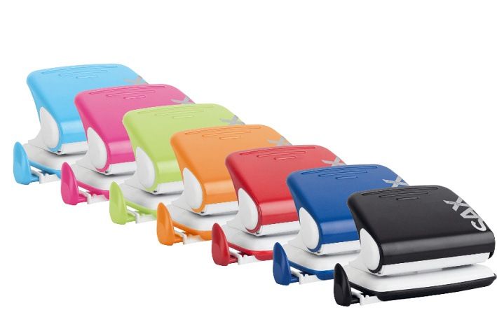 Kovová děrovačka s elegantními plastovými doplňky a ergonomickou úchopovou částí. Ukazatel středu děrování, posuvné pravítko pro děrování formátu DIN. Kapacita děrování 15 listů.