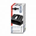 Ekonomická děrovačka s kovovým mechanismem. Rozteč mezi otvory 8 cm. Příložník na papíry různých rozměrů nebo patentovaný způsob děrování pomocí kroužků pořadače. Blokovací systém pro úsporu místa. Na děrování 20 listů. Barva černá.