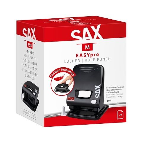 SAX 358 děrovačka M s technologií SAX EASYpro. Bezproblémové dírkování s minimální silou – ideální na váš stůl, do kanceláře nebo doma. Kapacita: až 30 listů se 2 otvory vzdálenost 80 mm). Funkce uzamčení pomocí posuvného ovladače pro kompaktní skladování. Lehce vyprázdnitelný zásobník na odřezky, pryžové nožičky na spodní straně. Posuvné pravítko pro nastavení velikosti papíru.