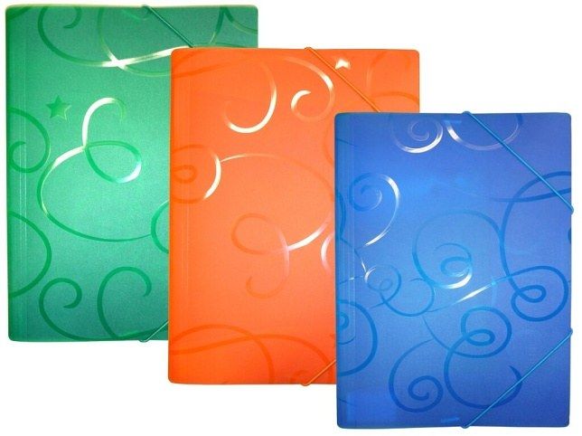 Desky z polypropylenu se třemi vnitřními chlopněmi a gumičkou na uzavření.