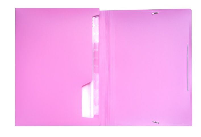 Desky na dokumenty s gumou a rejstříkem. Tyto elegantní polypropylenové desky v pastelově růžové barvě obsahují 13 kapes, které jsou vhodné pro formát A4 a menší dokumenty. Desky obsahují vkládací štítky pro snadnou identifikaci obsahu. Uzavírají se pomocí elastické gumy.