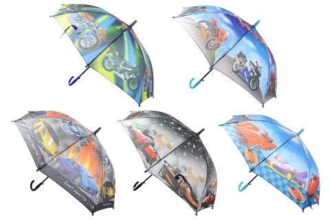 Vystřelovací deštník s motivy aut a motorek. Rozměry rozloženého deštníku cca 86 x 86 x 66 cm. Rozměry balení cca 67 x 8,5 x 4 cm. Baleno v igelitovém sáčku.
